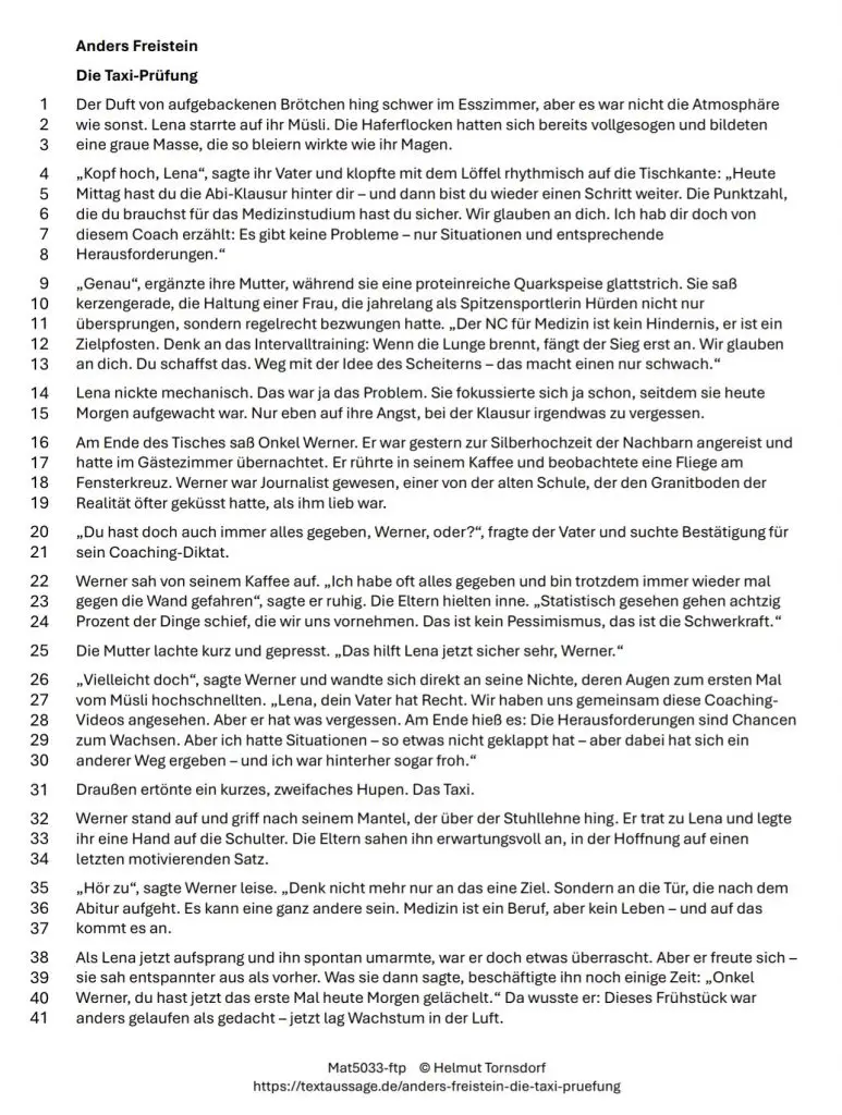 „Kopf hoch, Lena“, sagte ihr Vater und klopfte mit dem Löffel rhythmisch auf die Tischkante. Er trug bereits sein Business-Hemd. „Heute Mittag hast du die Abi-Klausur hinter dir – und dann bist du wieder einen Schritt weiter. Die Punktzahl, die du brauchst für das Medizinstudium hast du sicher. Wir glauben an dich. Ich hab dir doch von diesem Coach erzählt: Es gibt keine Probleme – nur Situationen und entsprechende Herausforderungen.“