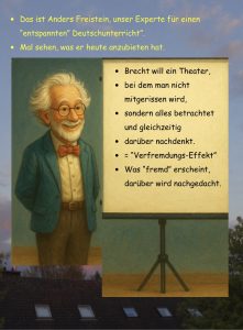 Den erreicht er für sich dadurch, dass zum Beispiel hinter den Schauspielern auf der Bühne noch andere Leute laufen, die zum Beispiel Spruchtafeln hochhalten, die das Gegenteil von dem aussagen, was gerade auf der Bühne läuft.
