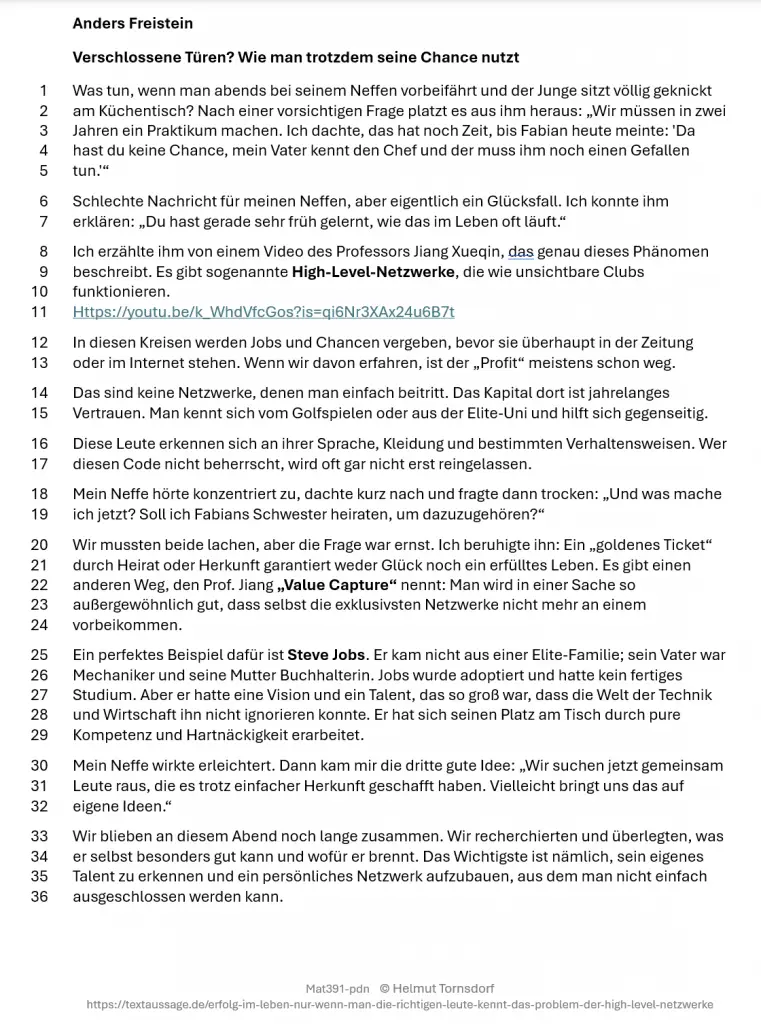 Was tun, wenn man abends bei seinem Neffen vorbeifährt und der Junge sitzt völlig geknickt am Küchentisch? Nach einer vorsichtigen Frage platzt es aus ihm heraus: „Wir müssen in zwei Jahren ein Praktikum machen. Ich dachte, das hat noch Zeit, bis Fabian heute meinte: ‚Da hast du keine Chance, mein Vater kennt den Chef und der muss ihm noch einen Gefallen tun.’“