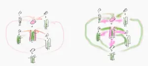 - Das unvollständige und teilweise falsche Doppelschaubild hatte natürlich grundsätzlich in der richtigen Idee der Anordnung der Figuren und der Verwendung von Farben für Identität und Beziehungen bzw. Einwirkungen schon etwas Wesentliches geleistet – nämlich eine Grundidee geliefert.