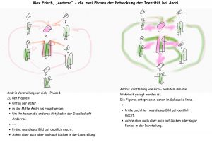 Normalerweise ist damit das Unterrichtsziel erreicht, wenn das Schaubild verstanden worden ist. Es macht ja auch sehr schön deutlich, dass zunächst Andri nur mühsam seine angeblich jüdische Identität annehmen will – und als man ihm dann eine andere nahebringen will, geht er nicht mehr mit.