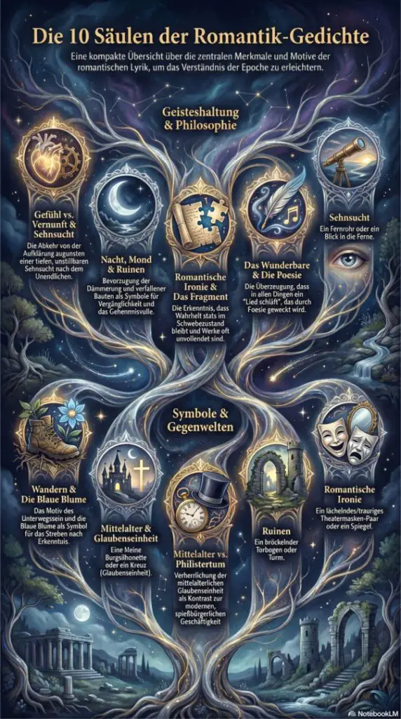 - Der doppelte Boden: Ganz unten findet ihr die romantische Ironie. Das ist der Moment, in dem der Dichter seine eigene Traumwelt plötzlich bricht, um zu zeigen: Alles ist nur ein Schwebezustand, keine absolute Wahrheit.