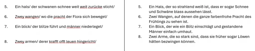 - Hyperbel (Übersteigerung): Die weiße Haut des Halses wird so extrem idealisiert, dass sie „schwanen-schnee weit weit zurücke sticht“ (Z. 5).