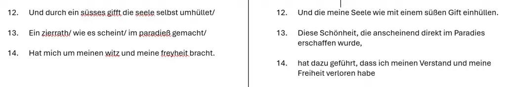 — - Oxymoron (Widerspruch in sich): Die Wirkung auf die Seele wird als „süsses gifft“ (Z. 12) bezeichnet. Dies verdeutlicht die unauflösbare Verbindung von Genuss und Zerstörung.