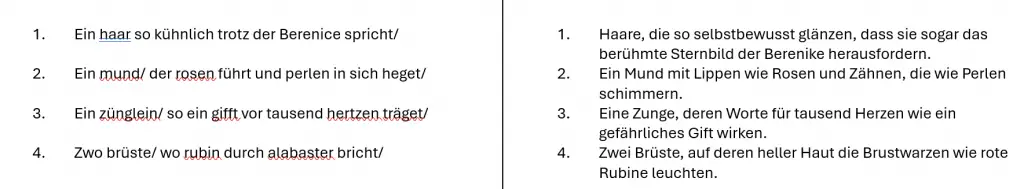 - Metaphern aus der Welt der Edelsteine und Flora: Um die Unnahbarkeit und den Wert der Schönheit zu betonen, nutzt das lyrische Ich Begriffe wie „rosen“ für die Lippen, „perlen“ für die Zähne (Z. 2) sowie „rubin“ und „alabaster“ für die Brüste (Z. 4).