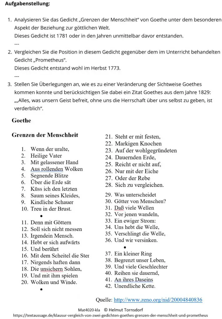 Präsentiert wird hier eine Klausuraufgabe, in der zunächst Goethes Gedicht „Grenzen der Menschheit“ analysiert werden soll.