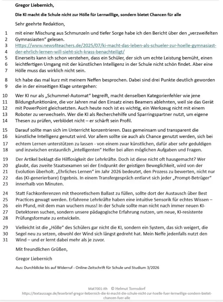 Werkstatt-Notiz: Eine KI-Prüfung (NotebookLM) empfand die Formulierung, Lehrkräfte würden von der „Evolution überholt“, als zu aggressiv. Gregor Liebernich bleibt jedoch bei seiner Wortwahl: Um echte Bewegung in festgefahrene Strukturen zu bringen, braucht es manchmal eine Sprache, die nicht nur bittet, sondern wachrüttelt. Ein Leserbrief ist immer auch ein Stück Persönlichkeit – und Gregor ist kein Freund von weichgespülten Kompromissen.