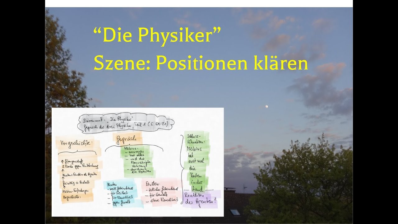 Gezeigt wird im Video, wie man aus einem Szenenauszug eines Theaterstücks die Positionen der Figuren herausarbeit. In diesem Falle geht es um den ersten Teil des Gesprächs der beiden Agenten mit Möbius. Wichtig ist die Klärung der Vorgeschichte bis zur Feststellung, dass sie jetzt gefangen sind – wegen ihrer Morde. Im ersten Schritt der Analyse geht es dann um die Erfassung des Gesprächsverlaufs. Anschließend kann das, was gesagt worden ist, systematisch zusammengefasst werden. Zur Unterstützung haben wir ein Schaubild beigefügt.