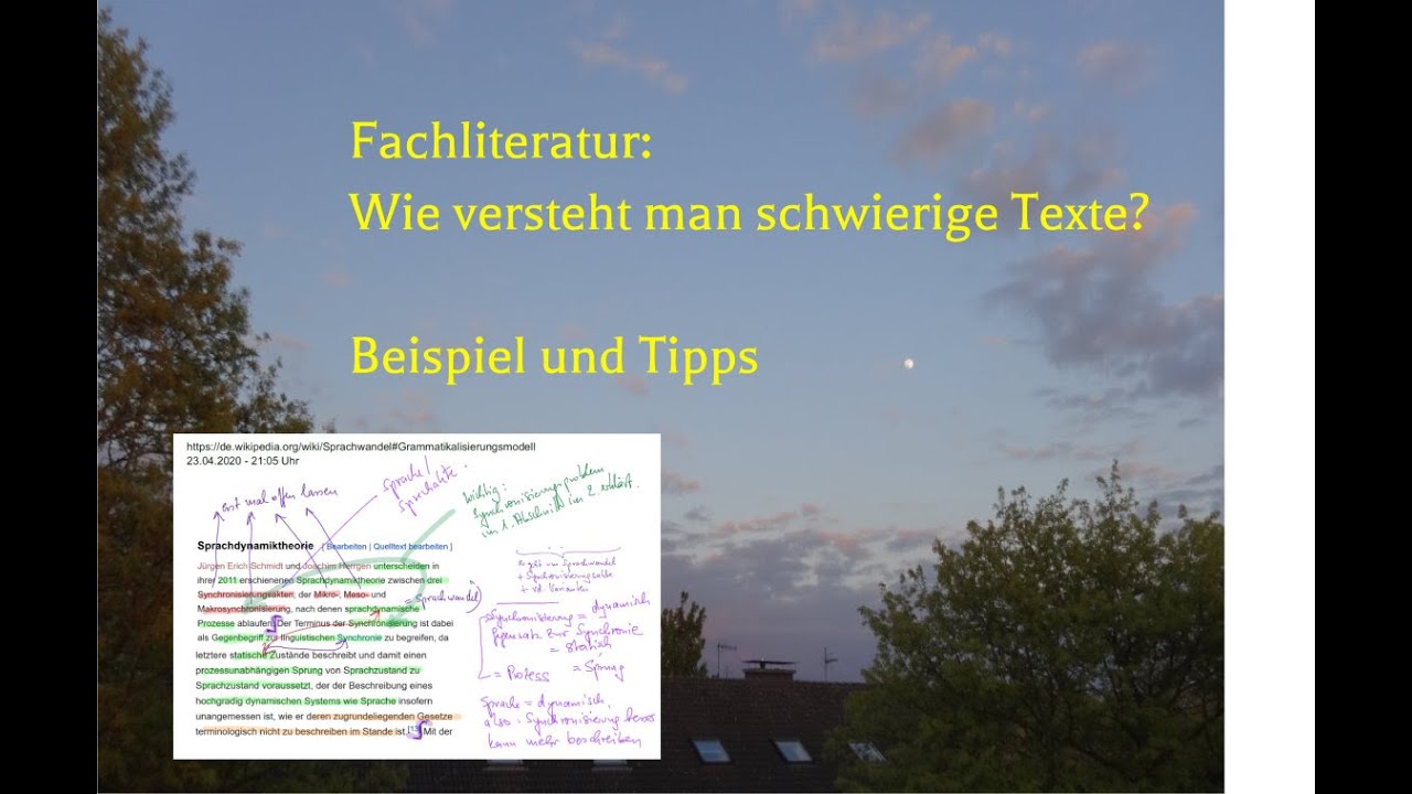Gezeigt wird an einem kurzen Auszug, wie man auch schwierige fachwissenschaftliche Texte verstehen kann. Ausgangspunkt ist ein kleiner Auszug aus einem Wikipedia-Artikel, der sehr fachwissenschaftlich geschrieben ist. Das erfordert einige Tricks: Zum Beispiel die Unterscheidung zwischen Verständlichem und noch Unverständlichem. Dann der Umgang damit: Nachdenken, Nachschlagen, Recherchieren und vor allem im Text selbst spätere Erklärungen nutzen. Thema des Artikelauszugs ist ein Aspekt des Sprachwandels, bei dem vor allem der Prozess betont wird. Alles wird aber so erklärt, dass man es auf eigene Texte übertragen kann.