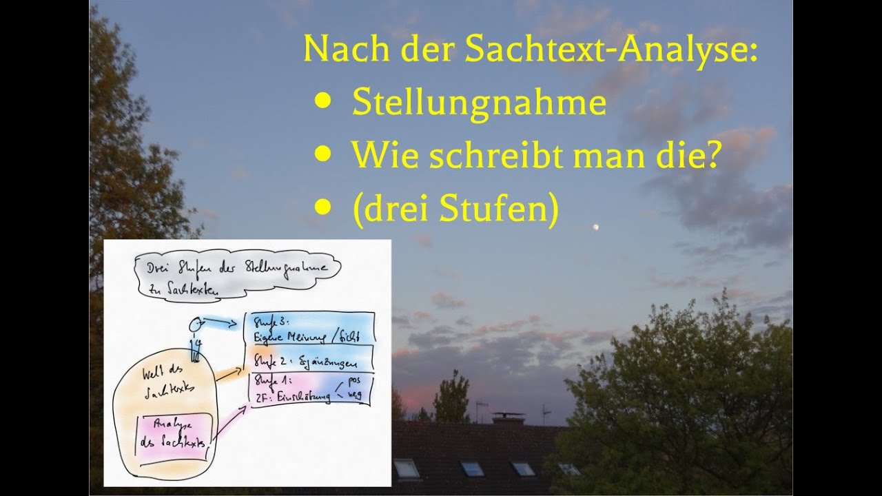 Da hat man den Sachtext analysiert – und jetzt soll man auch noch eine Stellungnahme schreiben. Im Video wird gezeigt, welche Varianten es dabei gibt und wie man sie am besten anordnet. Am wichtigsten für eine gute Note ist natürlich die Stellungnahme zum Text. Schwieriger zu bewerten ist die Stellungnahme zum Thema, weil es dabei bei verschiedenen Schülern unterschiedliche Kenntnisse und Erfahrungen geben kann. Am schwierigsten zu bewerten ist die persönliche Stellungnahme. Die darf subjektiv sein, aber sie sollte so präsentiert werden,dass sie in sich schlüssig ist.