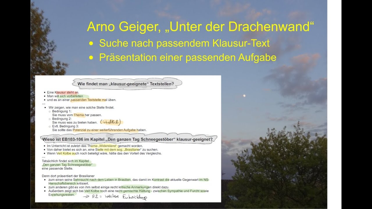 Gezeigt wird, wie man passende Textstellen findet, die für eine Klausur geeignet sind. So kann man zielgerichtet üben und mit etwas Glück findet man etwas besonders Passendes 😉 Präsentiert wird das Gespräch zwischen Veit Kolbe und dem „Brasilianer“ in Kapitel 10. Dazu gibt es eine passende Aufgabenstellung und Hinweise zur Lösung. Geplant ist, zu dieser Klausur in einem weiteren Video auch eine Übersicht über eine Musterlösung zu liefern.