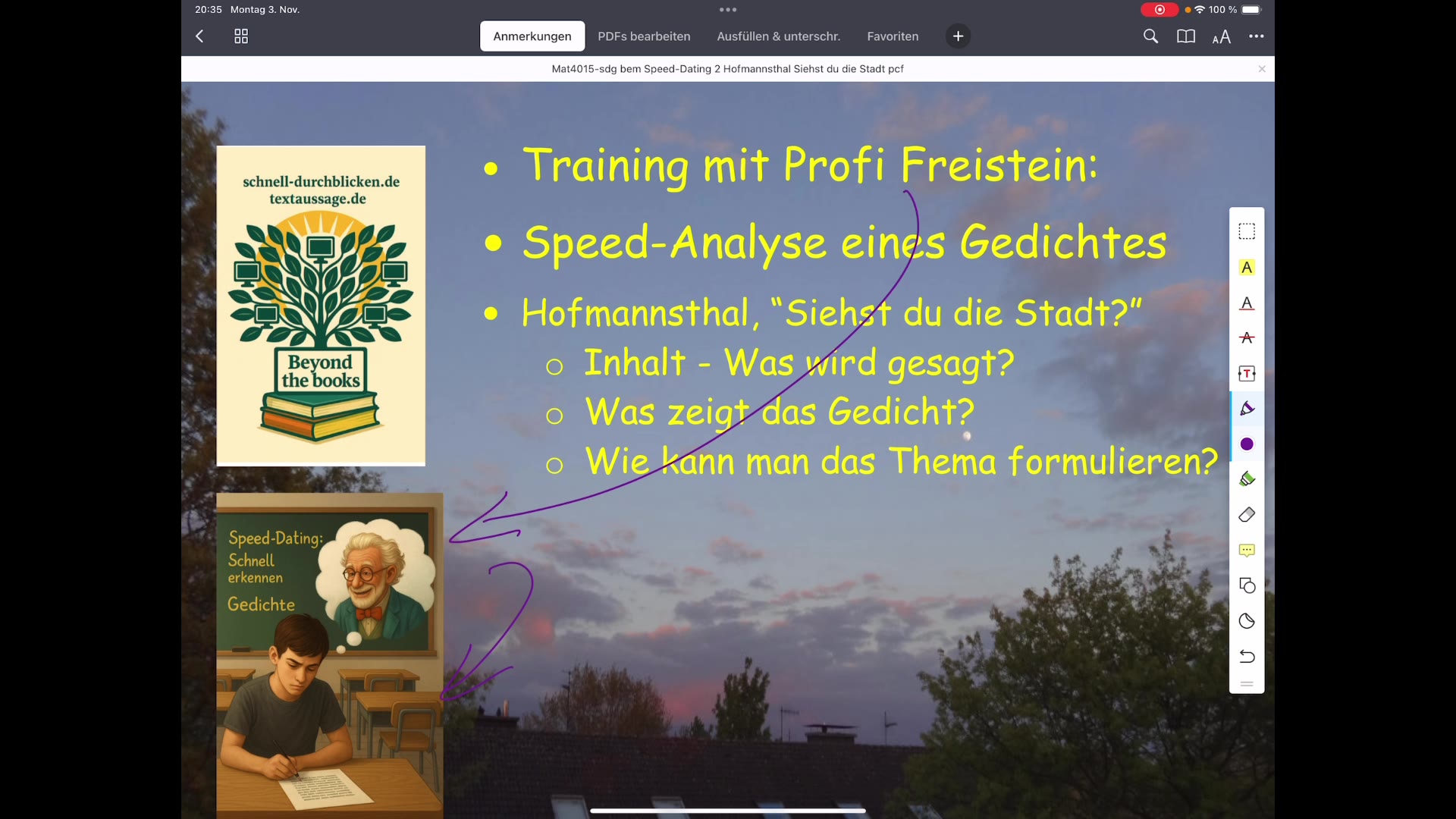 Wir zeigen, wie man schnell den Inhalt eines Gedichtes versteht und beschreiben kann. Außerdem, wie man die Aussagen des Gedichtes erkennt und das Thema benennen kann. Das Ganze geht wie bei einem Speed-Dating: Man hat nicht viel Zeit, weiß aber anschließend, woran man ist. --- Die Dokumentation zum Video ist hier zu finden: https://textaussage.de/profi-freistein-speed-dating-2-hugo-von-hofmannsthal-siehst-du-die-stadt