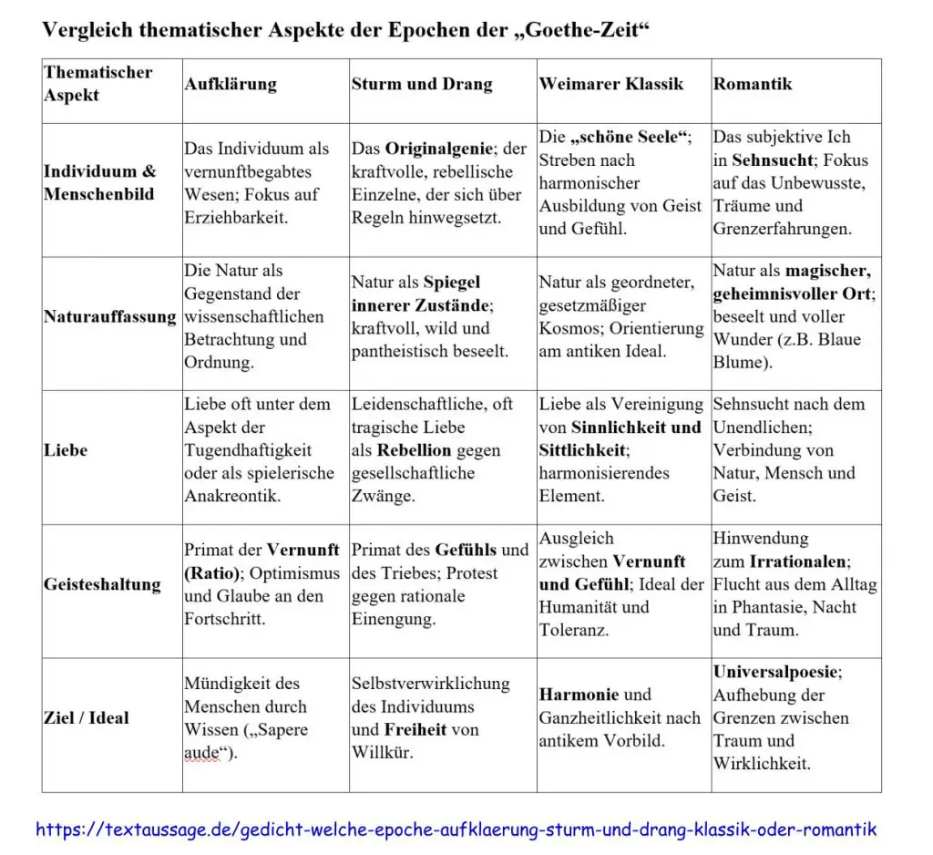 Dieses Gedicht ist der perfekte „Joker“ für Vergleiche mit Goethes „Werther“ oder Schillers „Räubern“. Man kann hervorragend herausarbeiten: Wo endet der leidenschaftliche Protest des Sturm und Drang, und wo beginnt die Sehnsucht der Romantik nach dem Unendlichen? Das Tabellenschaubild bietet hierfür das ideale Raster, um die feinen Unterschiede in der Intensität und Zielrichtung festzumachen. - https://textaussage.de/klausur-novalis-wohin-ziehst-du-mich-vergleich-romantik-sturm-und-drang