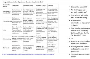 Dazu haben wir ein eigenes Video gemacht, das zeigt, wie man bei wichtigen Gesichtspunkten die einzelnen Epochen von der Aufklärung über den Sturm und Drang bis hin zu KIassik und Romantik unterscheiden kann.