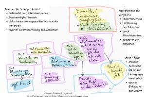 — - Goethe nutzt in beiden Werken die griechische Mythologie, um menschliche Grenzerfahrungen darzustellen. Kronos wird als Postkutscher (Schwager) personifiziert, der die Lebensreise lenkt, während Prometheus als Schöpfer und Rebell gegen den Olymp auftritt.