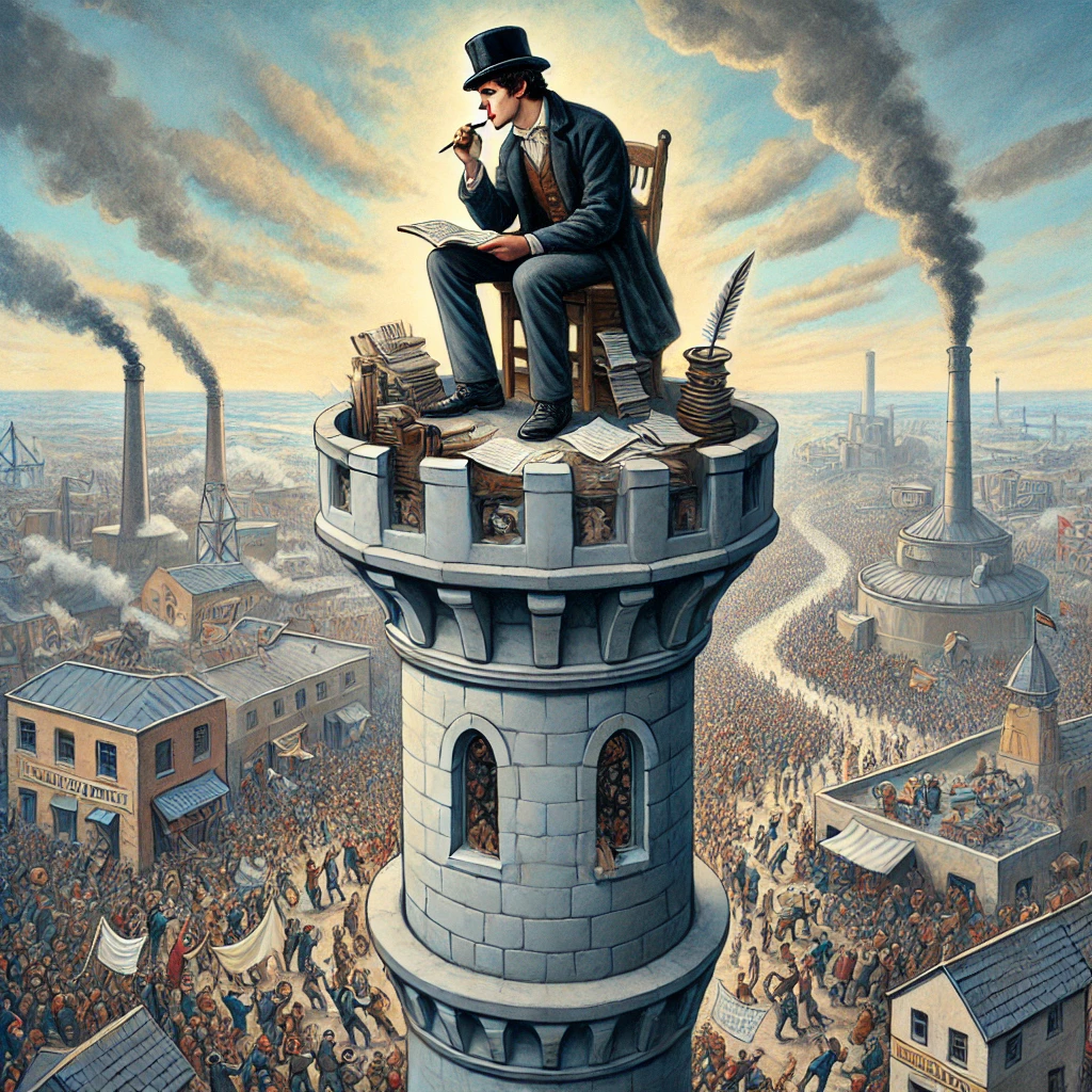 - Der Turm steht für den sogenannten „Elfenbeinturm“ – also einen speziellen Turm der Poesie, also einer Kunstwelt.